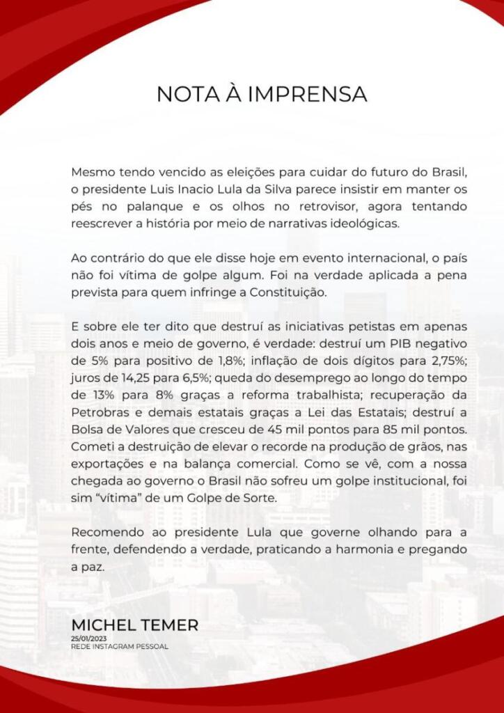 “Mesmo tendo vencido as eleições para cuidar do futuro do Brasil, o presidente Luiz Inácio Lula da Silva parece insistir em manter os pés no palanque e os olhos no retrovisor, agora tentando reescrever a história por meio de narrativas ideológicas”, disse Temer.