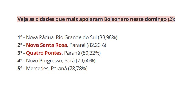 Por outro lado, os estados sulistas Rio Grande do Sul, Santa Catarina e Paraná têm as cidades mais bolsonaristas do país.