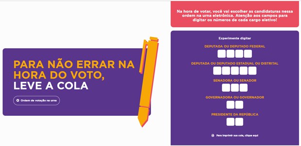 Com a proibição do uso de celular na cabine no momento da votação, eleitores poderão levar a chamada “cola eleitoral”. No portal do Tribunal Superior Eleitoral (TSE), há uma cola para o eleitor imprimir e preencher com os números dos candidatos nos quais pretende votar.