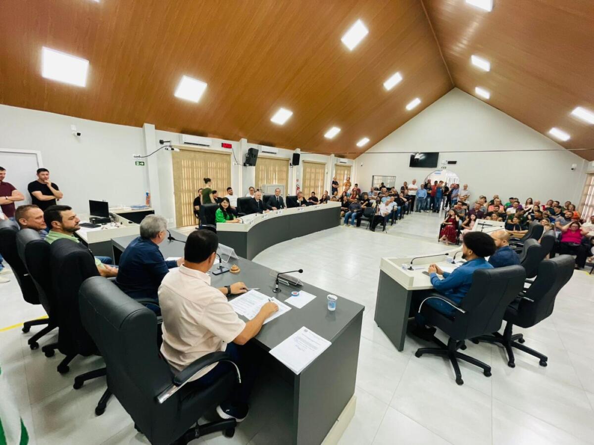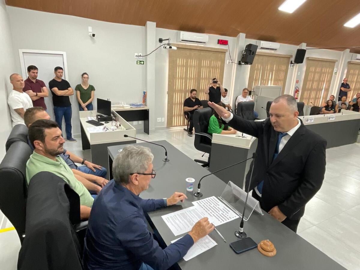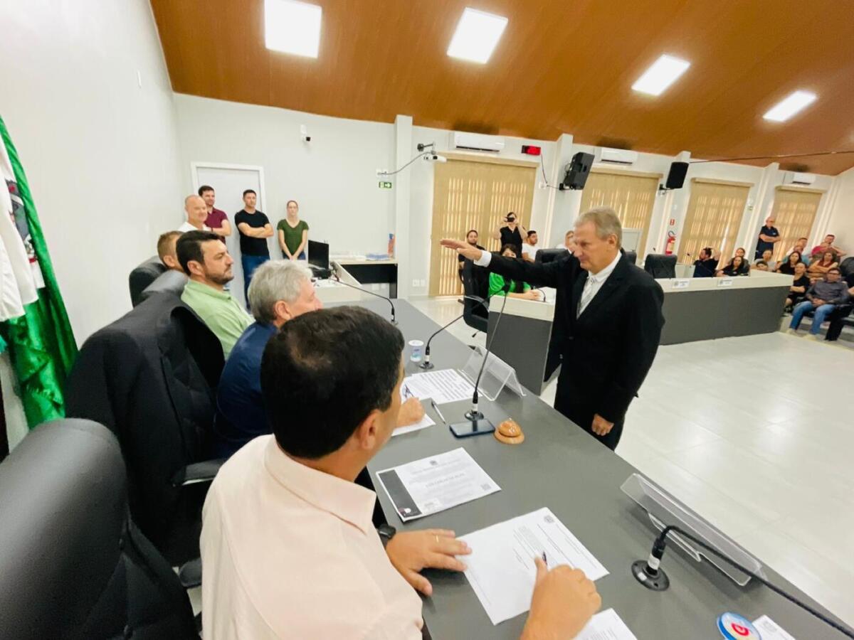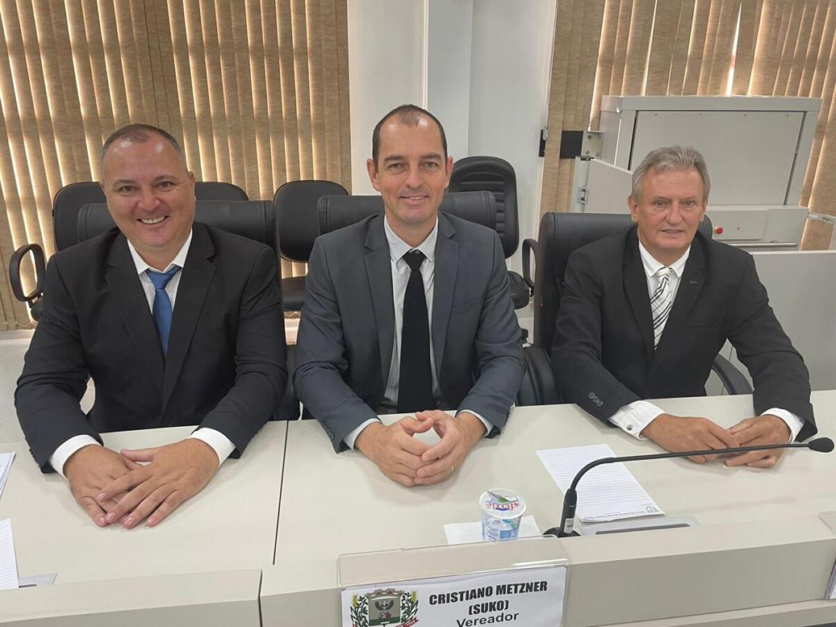 Com plenário lotado e presença do prefeito Adriano Backes e do vice-prefeito Vanderlei Sauer (Soldado Sauer), aconteceu na manhã desta quinta-feira (9) a sessão solene de posse como vereadores dos suplentes Carlinhos Silva (PP), Cristiano Metzner (Suko/REPUBLICANOS) e Rodrigo Pulga (Verde/UNIÃO).
