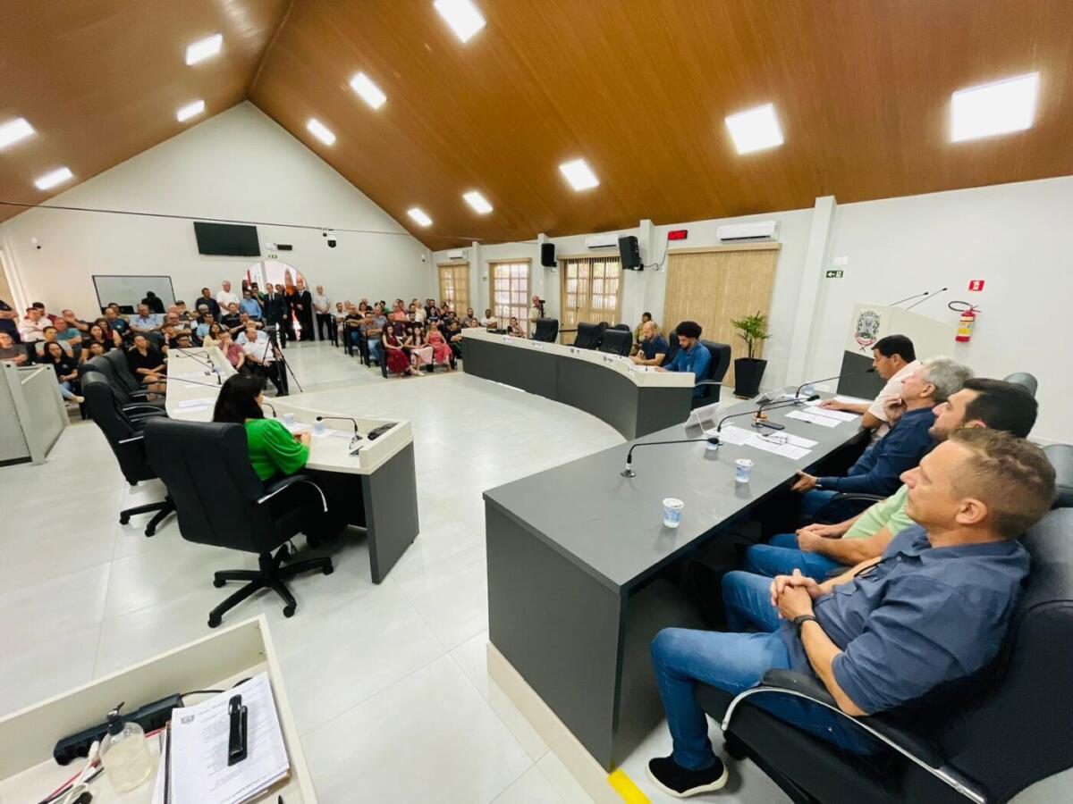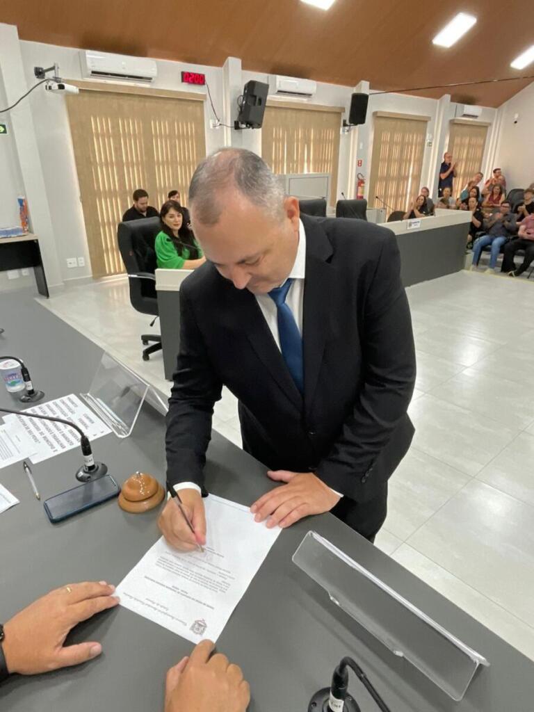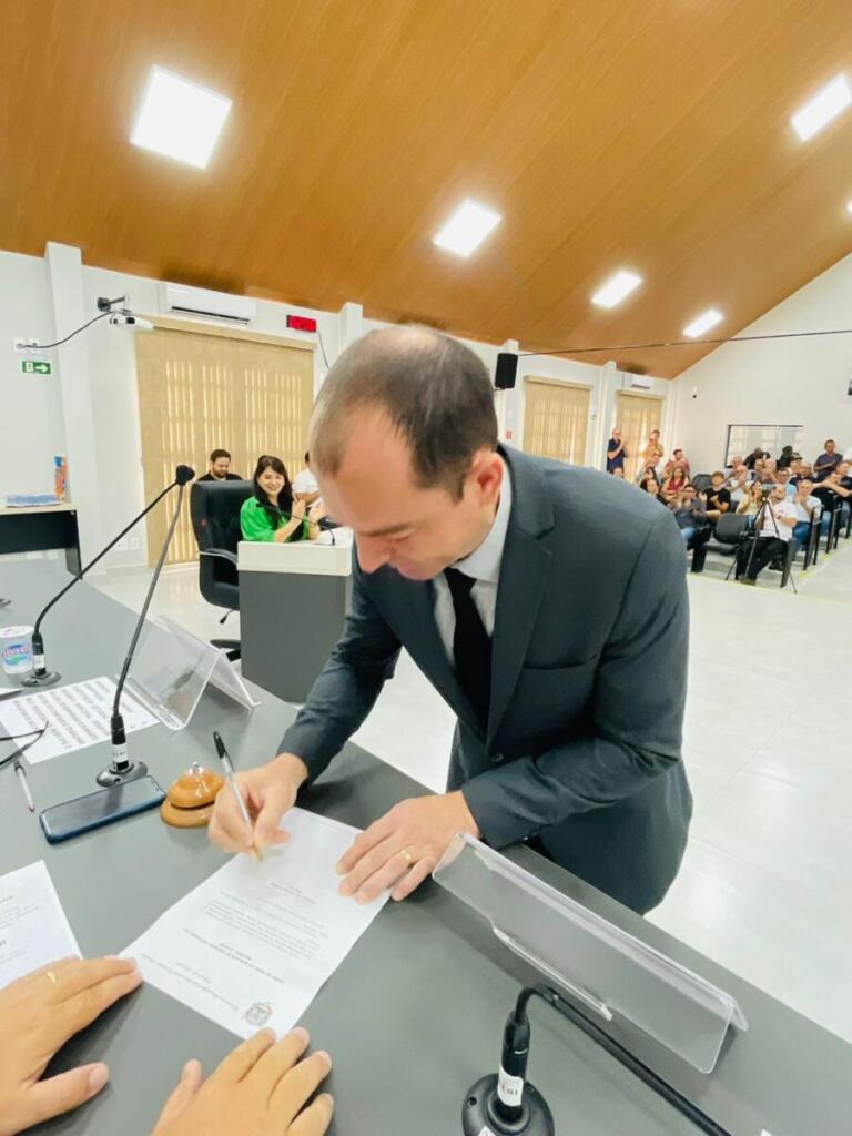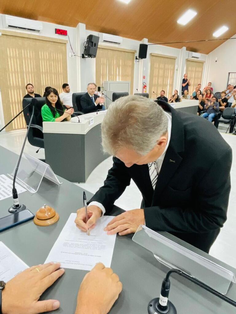 Com plenário lotado e presença do prefeito Adriano Backes e do vice-prefeito Vanderlei Sauer (Soldado Sauer), aconteceu na manhã desta quinta-feira (9) a sessão solene de posse como vereadores dos suplentes Carlinhos Silva (PP), Cristiano Metzner (Suko/REPUBLICANOS) e Rodrigo Pulga (Verde/UNIÃO).