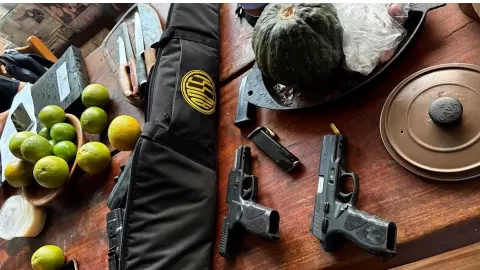 Mandado de busca e apreensão, apreendeu armas de fogo, munições, material de caça e carne congelada de peixes