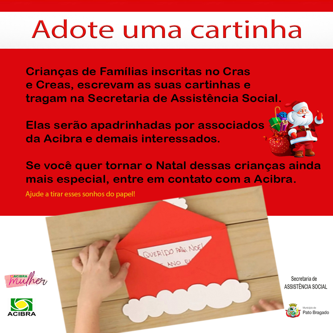 A Secretaria de Assistência Social e a Acibra Mulher de Pato Bragado estão promovendo a Campanha “Adote uma Cartinha”. O objetivo é…