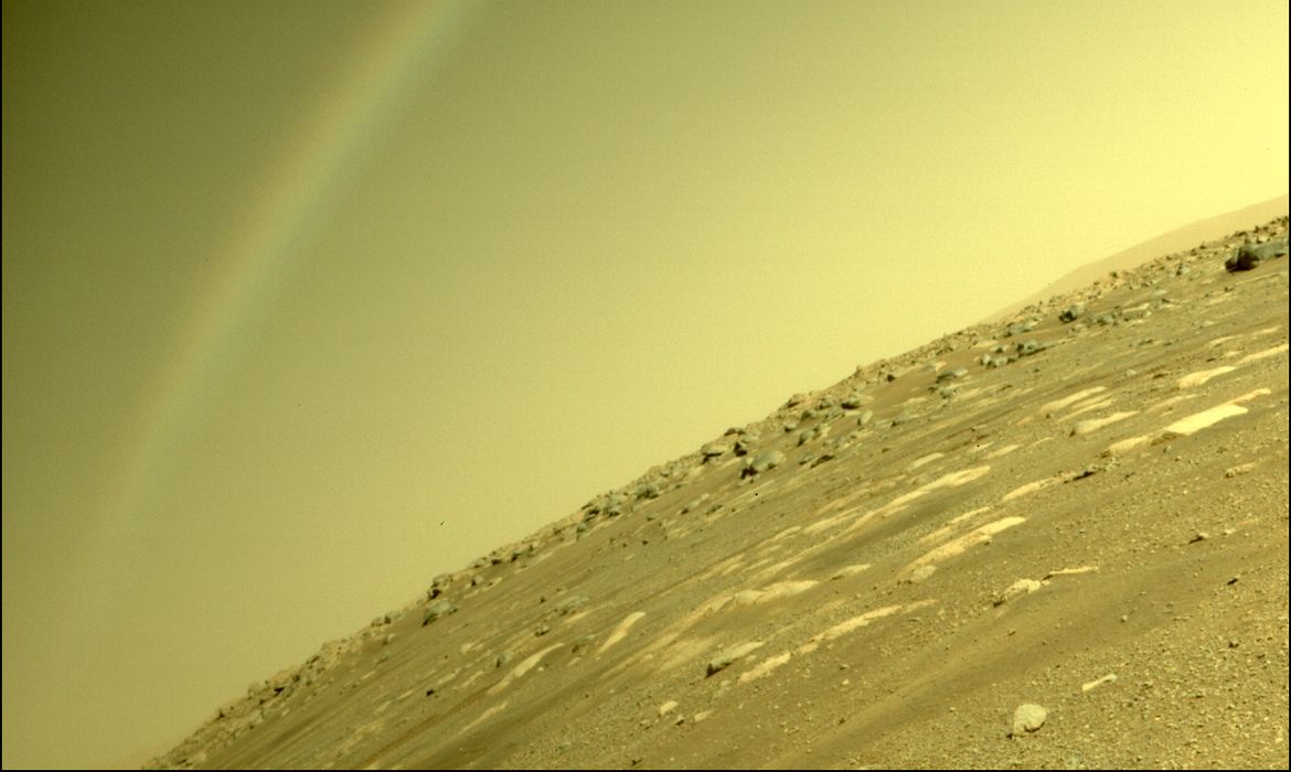 Um fenômeno inusitado foi capturado pelo sonda robô Perseverance, da agência aeroespacial norte-americana Nasa, que explora desde fevereiro o solo marciano. Uma foto tirada pela Perseverance mostra um arco-íris no céu do planeta vermelho – algo considerado impossível, já que o fenômeno ocorre por causa da refração da luz solar nas partículas de água suspensas na atmosfera. Como Marte possui uma atmosfera fina e gelada, não há possibilidade de haver água em estado líquido circulando livremente pelo ar.