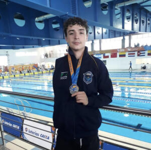 Vraja com uma das mais de 100 medalhas que conquistou nas piscinas: campeão paulista e brasileiro rumo às Paraolimpíadas de Paris (Foto: Gilson Carvalho Júnior)