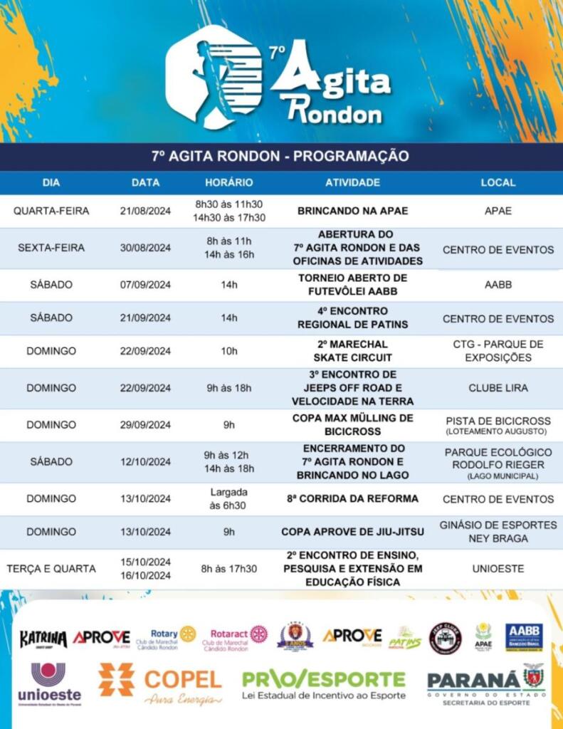 A programação contará com Encontro Regional de Patins, Skate Circuit, Encontro de Jeeps Off Road e Velocidade na Terra, Copa de Bicicross, Brincando no Lago, Corrida da Reforma, Copa de Jiu-Jitsu e Encontro de Educação Física (veja mais detalhes abaixo).