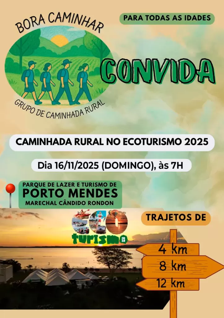 Neste domingo, 16 de outubro, o destino é Porto Mendes, dentro da programação do Ecoturismo 2025, que acontece de sexta (14) a domingo. Além da caminhada, o público vai poder aproveitar uma série de atrações: shows nacionais gratuitos em parceria com a Secretaria de Estado do Turismo e o Ministério do Turismo, mais de 30 atividades esportivas e até espetáculo de balonismo.