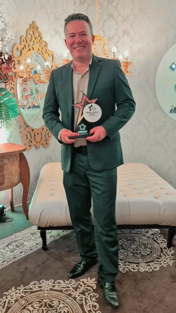 Entre os premiados da noite esteve o casal Marcelo Gimenes e Gracielle Blau. Eles foram reconhecidos por suas contribuições nas áreas de educação e comércio.