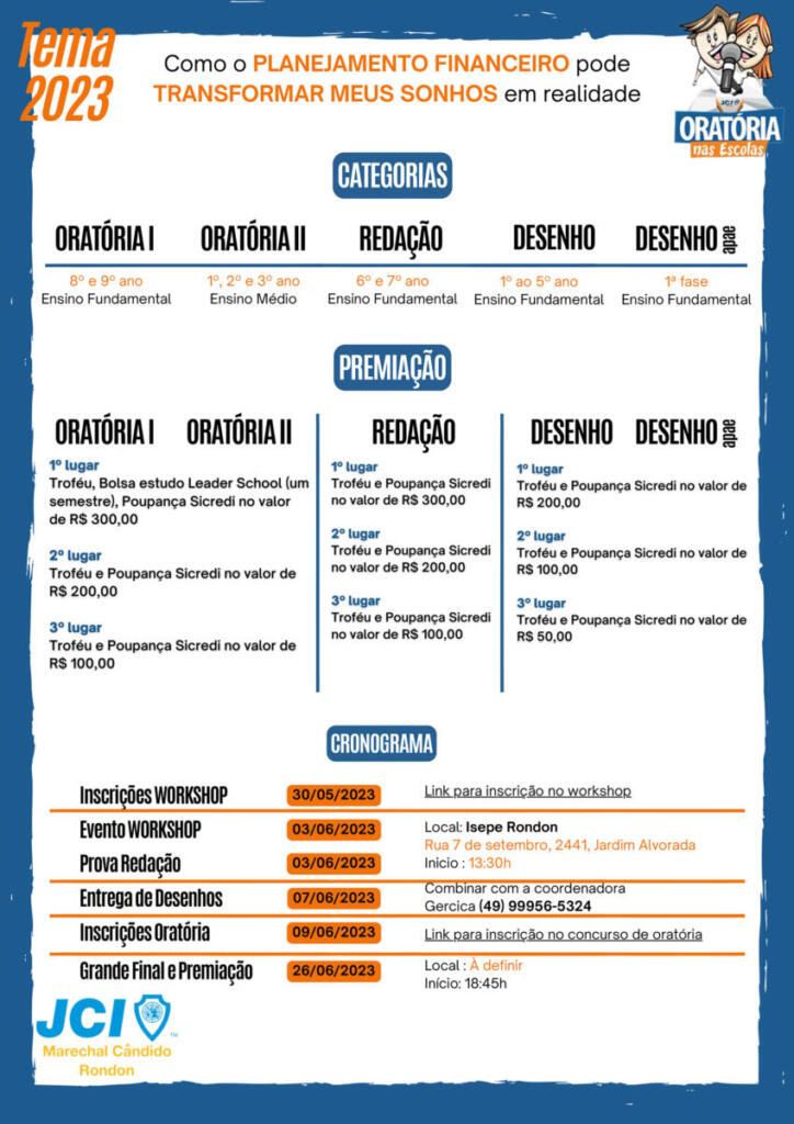 Jhonatan Röpke, presidente da JCI Marechal Rondon, e Gercica Cararo, coordenadora do concurso “Oratória nas escolas 2023”, participaram de um bate-papo com a jornalista Ana Paula Wilmsen (Fotos: Andressa Trentin/OP)Presidente da JCI, Jhonatan Röpke: “Neste ano, uma das novidades é a categoria desenho para a Apae. Muitas pessoas pediram a inclusão deste colégio, que faz um bonito trabalho em Marechal Rondon, e atendemos, mas não vamos englobar os alunos da Apae com alunos portadores de necessidades de outras instituições. É uma categoria só para os alunos da Apae”Coordenadora do concurso “Oratória nas escolas 2023”, Gercica Cararo: “Neste ano, o tema do concurso é ‘Como o planejamento financeiro pode transformar meus sonhos em realidade'”Durante entrevista ao O Presente, Jhonatan Röpke e Gercica Cararo deram detalhes sobre o concurso “Oratória nas escolas 2023” e também falaram um pouco sobre a JCI e dos próximos eventos que serão promovidos pela entidade