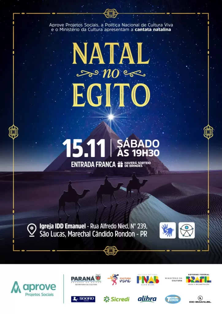 O diretor da Aprove, Gianmarco Stoef, e o diretor musical Edimilson Azevedo estiveram no O Presente, na segunda-feira (10), para divulgar um evento que acontece neste sábado, 15 de novembro, em Marechal Cândido Rondon: o Natal no Egito. Eles aproveitaram para convidar toda a comunidade a prestigiar a programação, que promete emocionar e envolver o público.