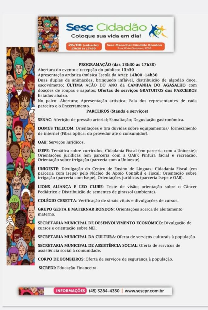 O gerente do Sesc de Marechal Cândido Rondon, Fernando Ferreira, e a técnica de Ação Social e Cultural, Verônica Villalba, estiveram no Jornal O Presente, nesta sexta-feira (25), para divulgar o “Sesc Cidadão”, evento de cunho social que vai acontecer neste sábado (26), nas dependências da unidade, das 13h30 às 17h30.